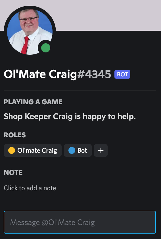 We have Ol'Mate Craig which is a bot that automatically gives people who join a role so they arent waiting for agesfor an admin to verify them so they can enjoy the content of the server instantly.